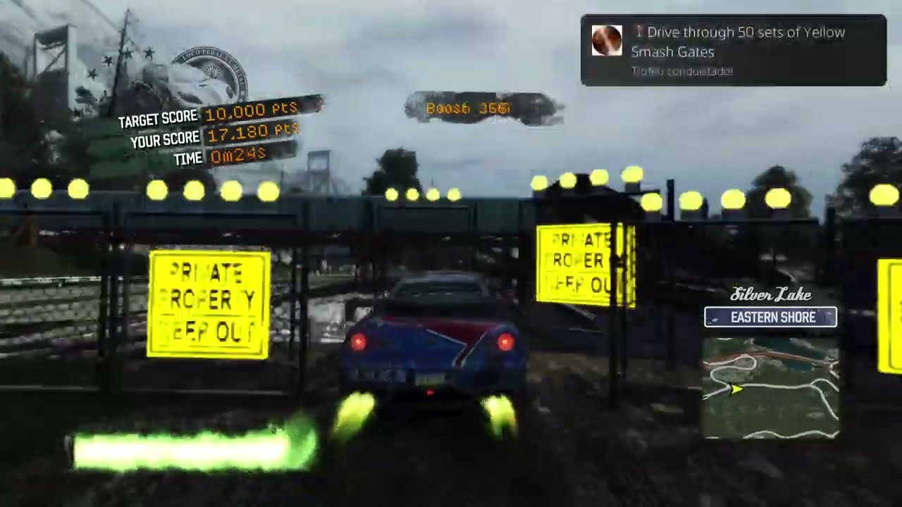 Localize e atravesse 50 Yellow Smash Gates diferentes espalhados por Paradise City. Cada portão só precisa ser atravessado uma vez para contar no progresso total. O jogo rastreia automaticamente quantos você já destruiu.